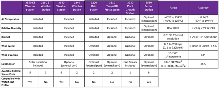 The fully integrated WatchDog 3250 Wireless ET Station measures temperature, humidity, rainfall, and wind speed/direction. It records and communicates the data to the cloud using its internal modem or radio. With these sensors, evapotranspiration (ET) can be computed by SpecConnect, indicating the amount of water leaving your field.