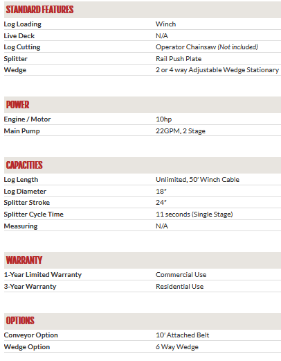 Has 10 HP engine, 4 way wedge, 16 gpm 2 stage hyd. pump, 11 second cycle time, 4″ x 24″ cylinder, will take up to 18″ diameter log and 4000 lb variable speed winch. Optional choker chains available.