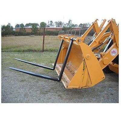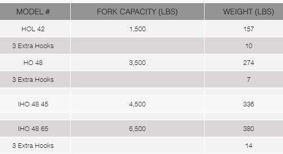 The Hook On Bucket Forks `HO` and Industrial Hook On Bucket Forks `IHO` are for Farm, Compact, and Industrial Loaders with lift capacities to 3,500, 4,500, and 6,500 pounds and comes with either 42 or 48 inch forks. Three hooks are welded to the top of the bucket so that the forks that are mounted on a bar can be easily mounted or removed.