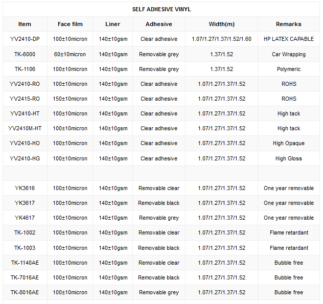 Self adhesive vinyl is compatible with various solvent and eco-solvent inks, UV printer which shows good color rendering, durability and stable ink absorption. It is available in a full range of widths up to 1.52m, which covers short term for promotion, medium and long-term usage. Various colors of adhesive like clear, grey and black, etc., to meet the different application requirement. Various types of liner to meet the market and printers demand.