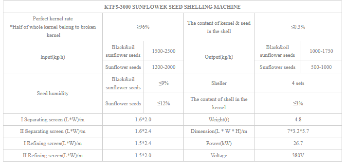 The KTF5-3000 Sunflower Seeds The KTF5-3000 Sunflower Seeds Shelling Machine is our patented product with the exclusive proprietary rights and having 80% of market share in China. The highest perfect kernel rate and maximum yield capacity of sunflower and black oil sunflower seeds are ensured by systematic shelling procedures, non-broken transportation, and efficient separating sieves assembly. The production begins with raw materials being fed in the dehullers and then shelled materials, the mixture consisting of kernels, husks and unshelled product is discharged to suspended separator. At this stage, a cyclone sucks and then removes hulls and dust, followed by separation of hulled kernels and unhulled seeds with vibrating screens. The unshelled seeds will be returned to dehullers. After passing of all of the stages, the finished product is ready and is deposited in the hopper. This product adopts bucket elevator to transport raw materials, which can avoid blockages effectively. Return processing system of non-broken hoist greatly reduces damages. Furthermore, the overall system of equipment is intelligentized with PLC electronically control system which is more efficient and convenient for regulation.