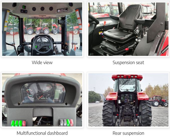 The series of tractors are good versatile helpers in a wide range of farm work. The 6-cylinder high-pressure diesel engine that adopts the common rail, air cooling and turbocharged technology deliver high horsepower while using less fuel. 18F/6R gears produce high operation efficiency with the maximum speed up to 40km/h. The main clutch applying the air-assisted technology reduces pedal effort to ensure easy and convenient operation. The hydrostatic steering unit ensures precise control and requires less operator effort. The wet disc brake greatly improves tractor safety. Activating electro-hydraulic control PTO only needs pressing a button. Carraro’s front axle offers the advantage of high reliability and durability. The enclosed cab provides operator a wide view and a comfortable experience as it is equipped with a climate control system. Rear wheels, a radial tire and a gear shifting synchronizer are optional to improve tractors’ performance.