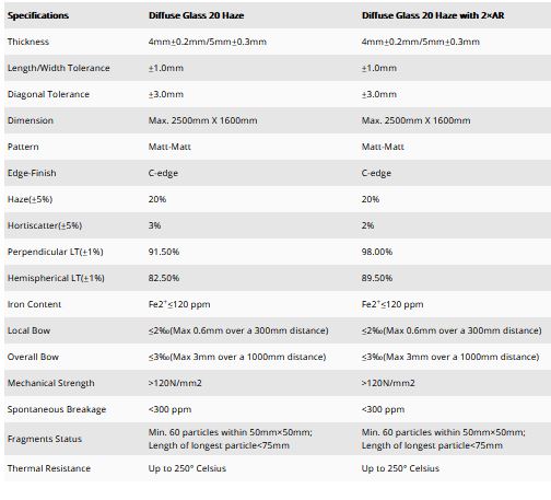 - With low-iron base (<120ppmFe2O) and leading etching AR technology, our glass has the highest light transmission standard in the world: For diffuse glass: ≥91.5±0.5%; For diffuse glass without 2×AR: ≥97.5±0.5%, 98.5% in average
