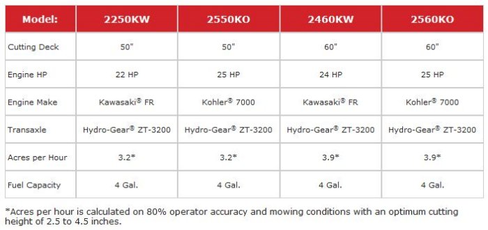 - High Horsepower – Choose from a Kawasaki® FS engine up to 24 horsepower or a 25 horsepower engine from Briggs & Stratton® or Kohler® to tackle your toughest mowing jobs.