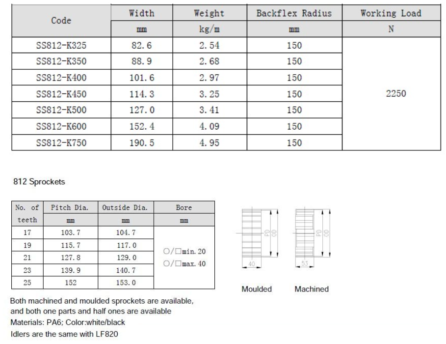 The main application is for conveying glass bottles. SS430 materials chains e.g. is suitable for soft drinks breweries, bottling plants and ss304 material chains for the wine industry. Chain lubrication is recommended. Mat.:SS304/SS430; Max.speed: 80m/min lubrication, 50m/min dry. Max.length: 15m.
