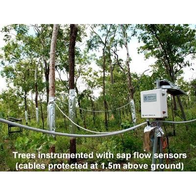 A PlantSensors PS-TDP8 sap flow system installed in a wet-dry tropical region. Due to frequent wild fire and potential animal damage, cables were kept 1.5m above ground.