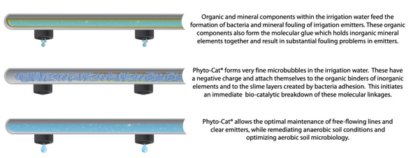 - Improve Soil Health: Phyto-Cat enhances the soil microbiome, especially the aerobic microbes and AMF (Arbuscular Mycorrhizal Fungi) within the soil which are essential to its health. Phyto-Cat dramatically reduces the accumulation of salts and iron in soils. Phyto-Cat replaces the acids and bleaches that are usually used to clear lines. These chemicals can enter the soil, make it acidic and damage the soil microbiome.