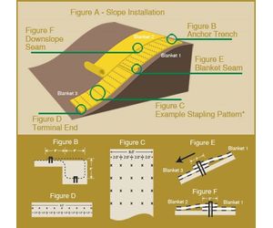 Excavate a trench along the top of the slope to secure the upstream end of the blanket. The trench should run along the length of the installation, be 6" wide and 6" deep. Staple blanket along bottom of trench, fill with compacted soil, overlap blanket towards toe of slope and secure with row of staples (shown in Figures A, B and D).