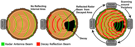 The technician thus creates a "radargram" - an ensemble of radar reflected waveforms - in a completely automated manner. The technician`s only task is to hold the antenna against the bark while walking around the tree; the field computer does the pulsing and recording automatically.
