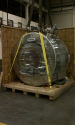 (An MRI magnet prepared for shipment. While shipping a heavy, expensive, fragile, and hazardous object such as this sounds complicated, it is actually a common place occurrence at Specialized.)