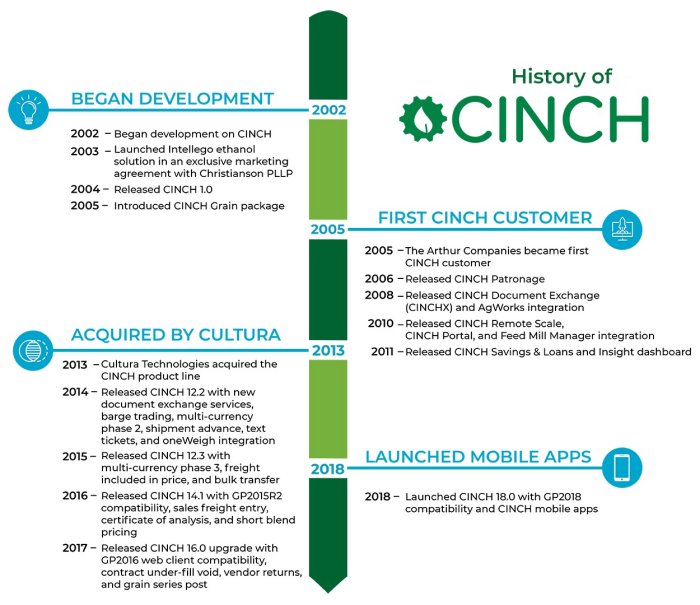 CINCH is the premier agribusiness solution that leverages the power of the Microsoft Dynamics GP financial platform. CINCH is stacked with powerful functionality, specifically designed for delivering outstanding and reliable performance as it handles mission-critical transactions for agricultural retailers, cooperatives, grain processors, grain elevators, millers, pulse processors, and seed companies.