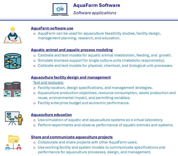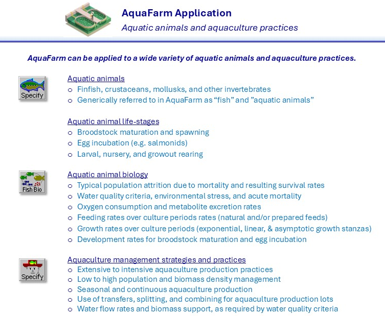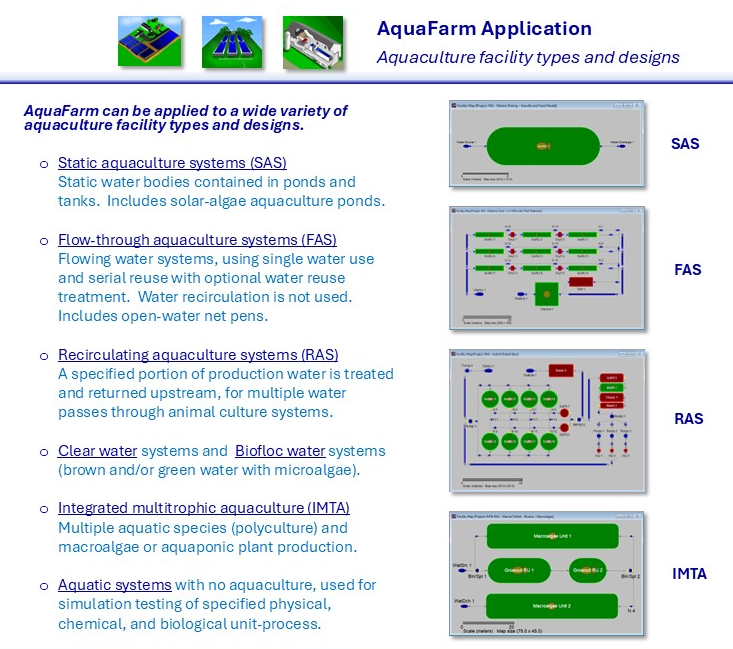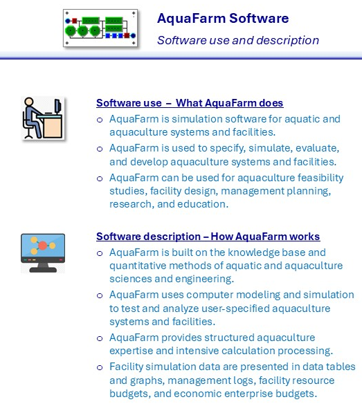 - AquaFarm uses computer modeling and simulation to test and analyze user-specified aquaculture systems and facilities.