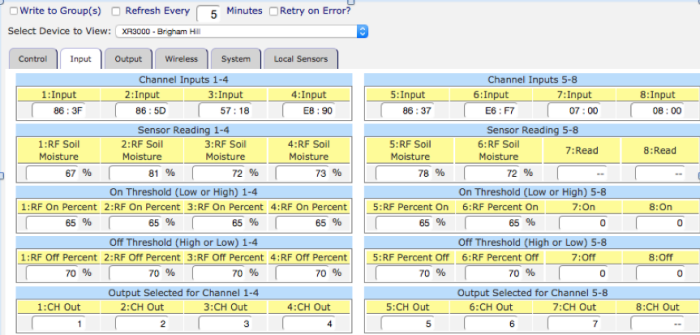 - Configure inputs to control specific outputs. The XR3000™ has 8 wireless inputs and 8 outputs. Each wireless input is configured as to which output is controlled by that input’s “ON”, “OFF” conditions. For example, if Output 1 was being used to turn on a pump, and the desired behavior was to turn on based on either Temperature or Soil Moisture, all of the wireless Temperature, and Soil Moisture sensors would be configured to control Output 1.