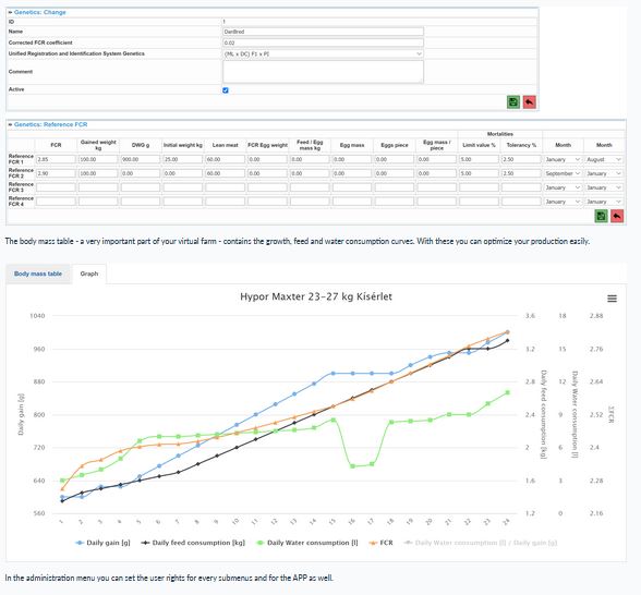 To create your virtual farm with all the barns, silos, warehouses, products, suppliers, customers etc. The events and transactions will be recorded here also. Create farm products such as genetics, body mass tables, nutrients, product groups etc. Record partners - suppliers and customers. Modify and delete data. Get your statistical report. To simplify the visulization we use simple and `easy-to-understand` colorization and the value of each color can be adjusted manually.