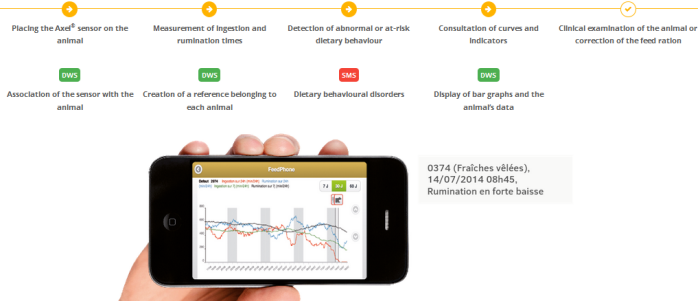 The FeedPhone® is the only service on the market to measure online both ingestion and rumination time. It determines the free mothod, from the trough or out to pasture and enables you to anticipate and quickly crrect dietary imbalances. With the bar graphs, curves and texts you can identify at a glance the animal with abnormal dietary behaviour.