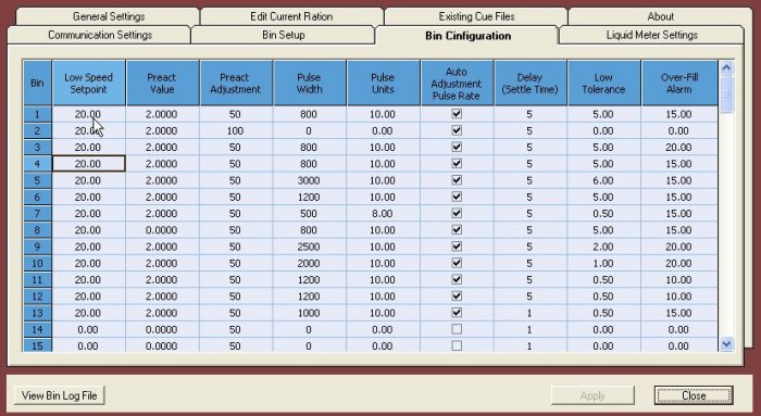 The system can be set up as a single scale or multi scale batching system and will control up to 4 liquid meters instantaneously. It supports multiple batch file processing and will create queue files that can be assigned for immediate batching or to be processed at a later date. Some additional features include down-stream control with an unlimited number of load-out bins, mixer discharge rate and grinder particle size settings for each ingredient. The user also has the option of manually operating the mill by double clicking the mouse button on a motor, gate or screw conveyor.