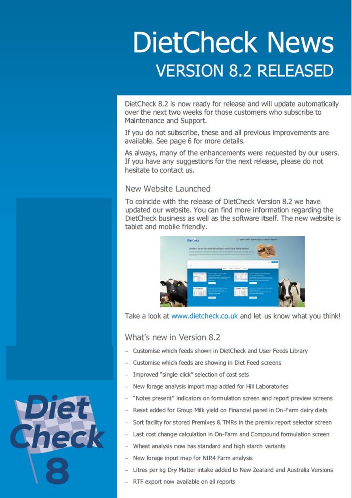 At DietCheck, we are dedicated to making the creation of diets as easy, scientific and precise as possible. Whether it be checking existing diets, hand mixing formulations or using Optimisation, rations can be created with just a few clicks of the mouse. What`s more, the feed databases and the models underpinning animal requirements are from published scientific calculations so you can be sure of their pedigree. DietCheck is used successfully to feed millions of animals worldwide.