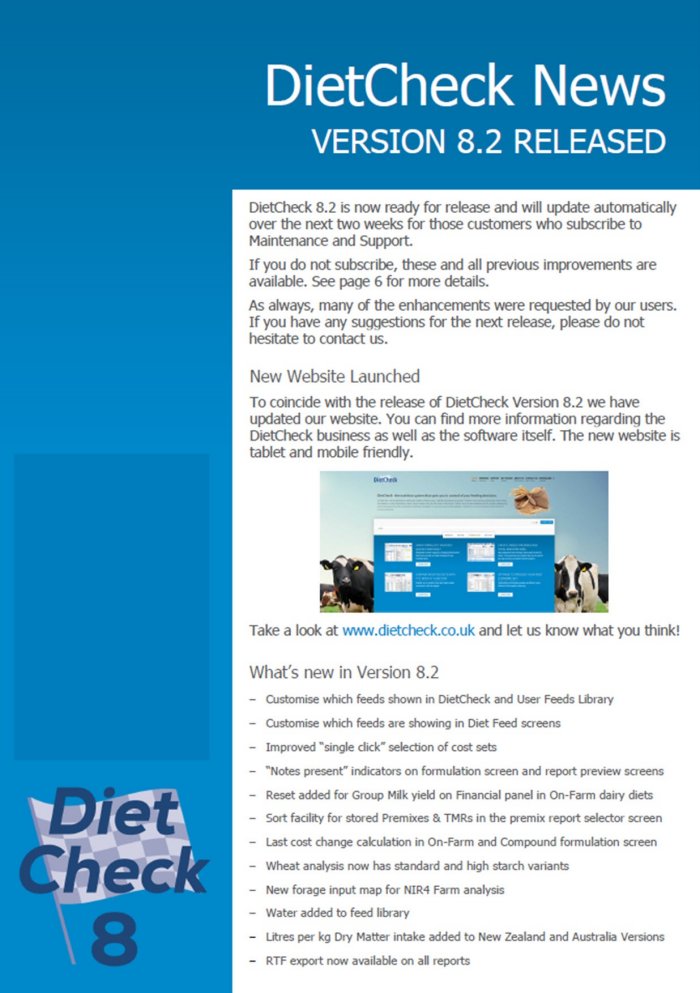 At DietCheck, we are dedicated to making the creation of diets as easy, scientific and precise as possible. Whether it be checking existing diets, hand mixing formulations or using Optimisation, rations can be created with just a few clicks of the mouse. What`s more, the feed databases and the models underpinning animal requirements are from published scientific calculations so you can be sure of their pedigree. DietCheck is used successfully to feed millions of animals worldwide.