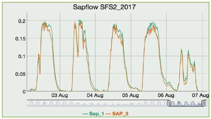 - Compare graphics of Sapflow Density with other measured data like PAR Radiation, Temperture etc Synchronized zooming (changing the time axis) and scrolling makes it possible to compare different data series in detail. This is a big benefit while interpreting sapflow data.