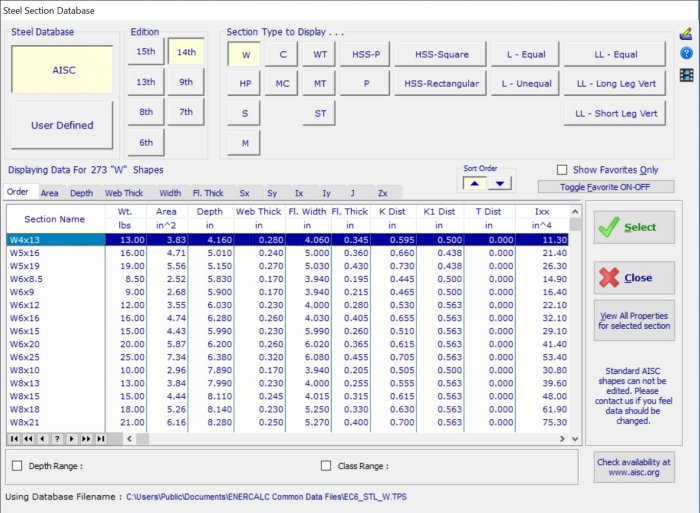 Essential to any project are the standard construction products that the engineer will employ to develop the final structure. ENERCALC provides databases of all typical rolled steel sections, sawn wood and engineered lumber sections, material grades for steel and wood and small databases for concrete block and rebar. In addition the user can create their own steel section databases and also mark “favorite” items in all databases to simplify the work according to their most frequent needs.